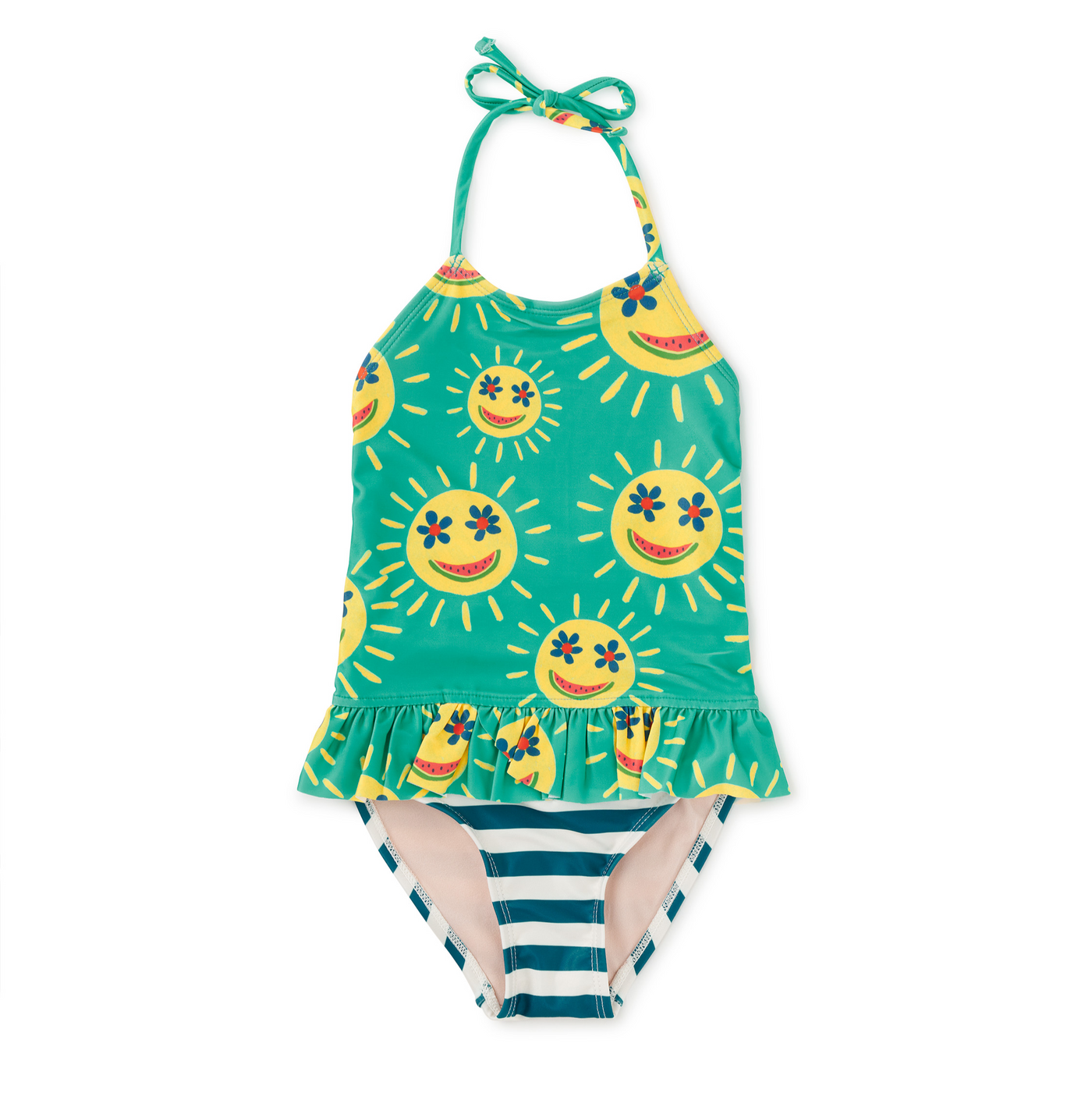 A customer favorite, an eye-catching two-print style comes together in a vibrant one-piece swimsuit. We know and trust that Tea Collection puts so much care into creating the perfect suit: UPF 50+ for sun protection, a fully lined interior, functional neck ties, and adorable ruffles at the waist. Plus, a scoop front neckline and low back add a playful touch. The polyester/spandex blend ensures the perfect fit and comfort. We recommend hand washing and laying flat to dry.