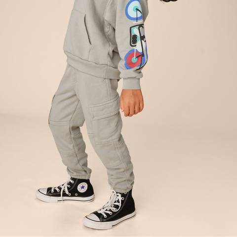 The comfiest cargos they'll ever wear, our versatile smoke-hued joggers feature pockets galore and lined knees for extra durability. Elastic leg openings and waist for no-fuss dressing. Made of 100% soft cotton French terry. Pair with a graphic tee to complete the outfit.