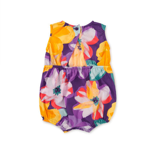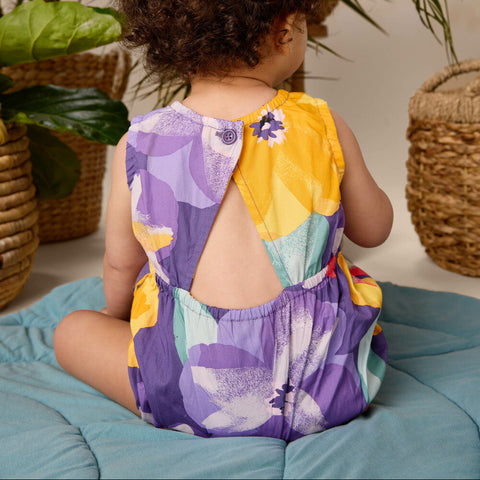 Bright, bold, and ready for sunshine! Inspired by the lush flora of Brazil, this sleeveless baby romper bursts with oversized tropical blooms in a palette of sunny yellows, hibiscus reds, and jungle purples. Made from lightweight 100% cotton poplin, it features a playful peek-a-boo back, comfy elastic openings, and easy snaps at the inseam for quick changes. The perfect blend of vibrant design and practical comfort--just right for summer adventures and sweet photo moments.