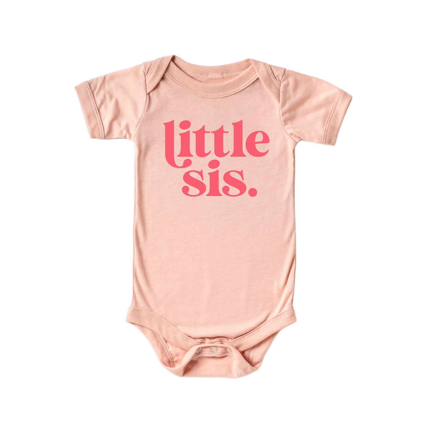 This adorable baby sister bodysuit is soft against sensitive skin, built to last through endless washes, and features a sweet coral “little sis.” print that makes it the perfect baby shower gift, new sibling outfit, or everyday essential.