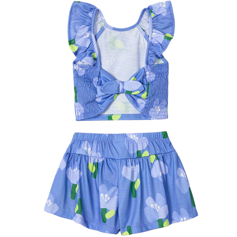 Dive into summer fun with our adorable kid girl's floral set, featuring a vibrant blue and green floral print! This charming outfit includes a sleeveless top with a flutter neckline that adds a touch of whimsy, perfectly paired with matching shorts that boast an elastic waistband for all-day comfort. The slightly cropped top and flowy shorts make it ideal for playdates or beach outings, ensuring your little one stays stylish and cool. Made from 100% polyester, this set is not only fashionable but also easy to care for, making it a must-have for any young fashionista's wardrobe!