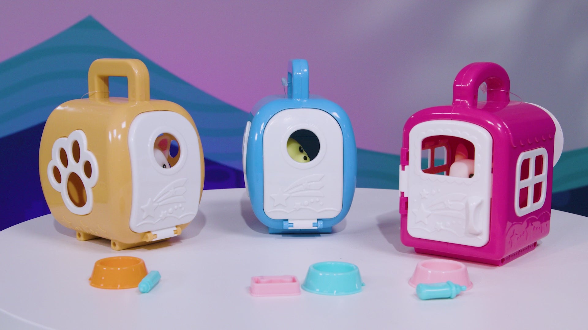 Bitty Buddies come in 4 animal styles, including a rabbit, kitten, hamster, or puppy dog. Each tiny animal figurine is made with nontoxic, high-quality plastic and features soft round eyes. The dog and cat also wear colored collars. Each Bitty Buddies toy comes with its own brightly colored plastic carrying case and care accessories. Each case has a tiny handle at the top and a white door that swings open and close. Pet-carrying cases are blue, pink, or orange. Included accessories vary but may include a small pink bowl, as well as either a bottle or bone.
