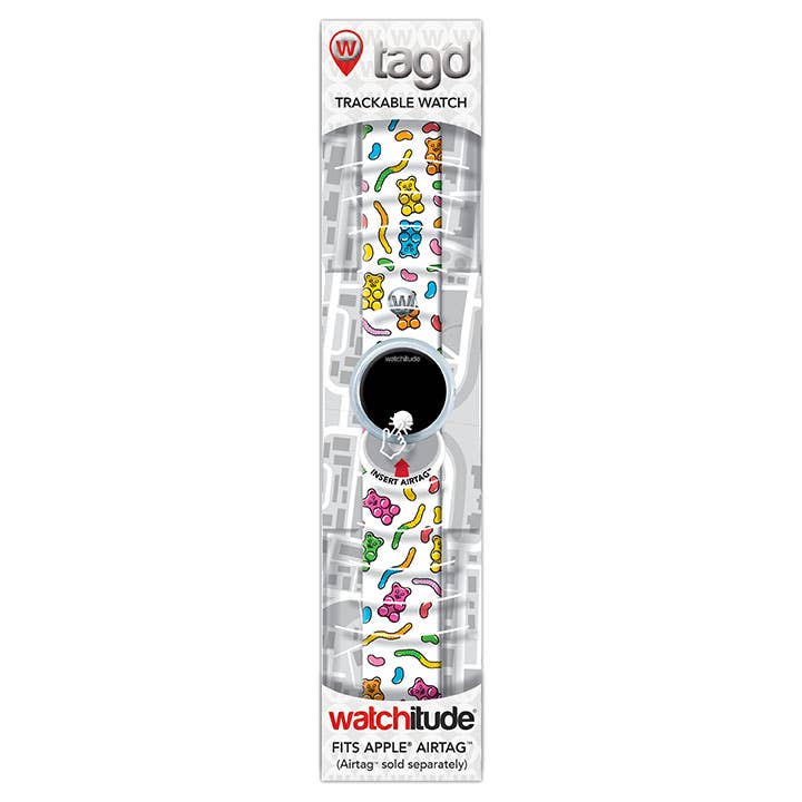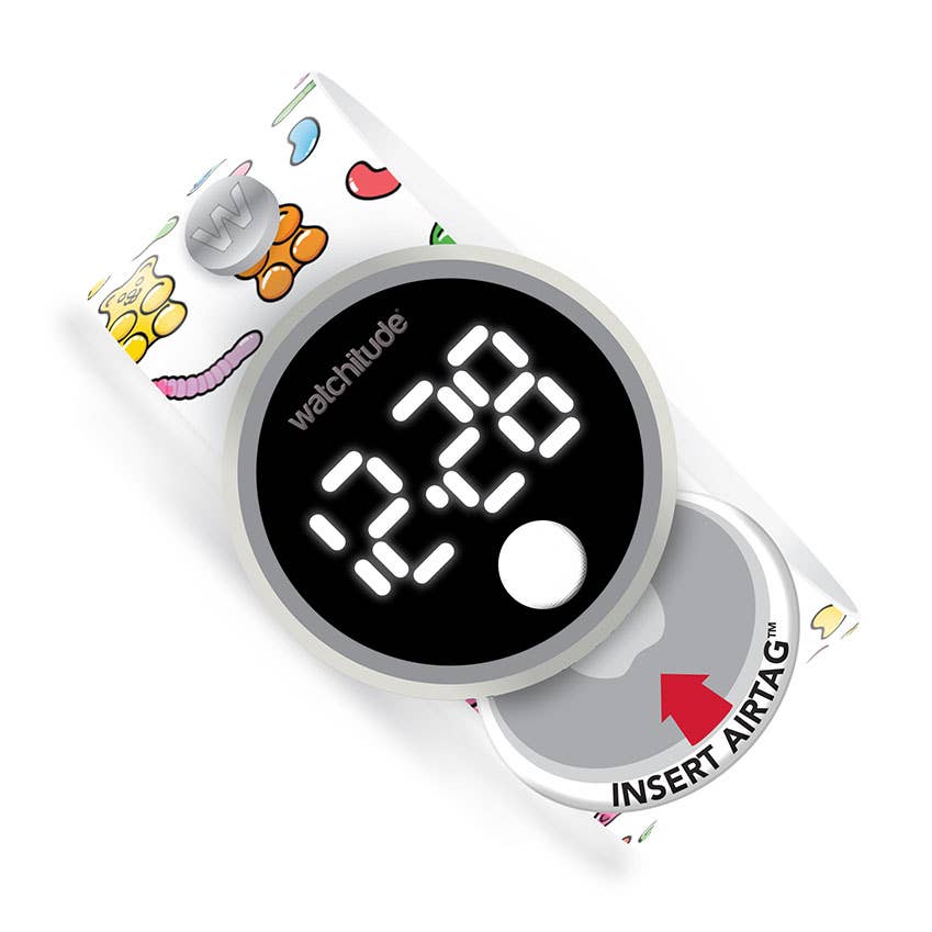 Watchitude brings to you the Gummies - Tag'd By Watchitude, a vibrant wrist watch designed specifically for kids aged 4-12. Known for our creative and colorful designs, this wrist watch is no exception. It's a beautifully printed image on the band and face that never fades or peels, thanks to our patent pending process. This watch is more than just an accessory, it's a collectible, limited edition piece that lets your child express their originality and attitude. Built to last, it features a quality analog quartz movement, is water resistant and made with a durable zinc alloy casing. The band is a 100% virgin white silicone slap band, certified safe and completely lead-free.