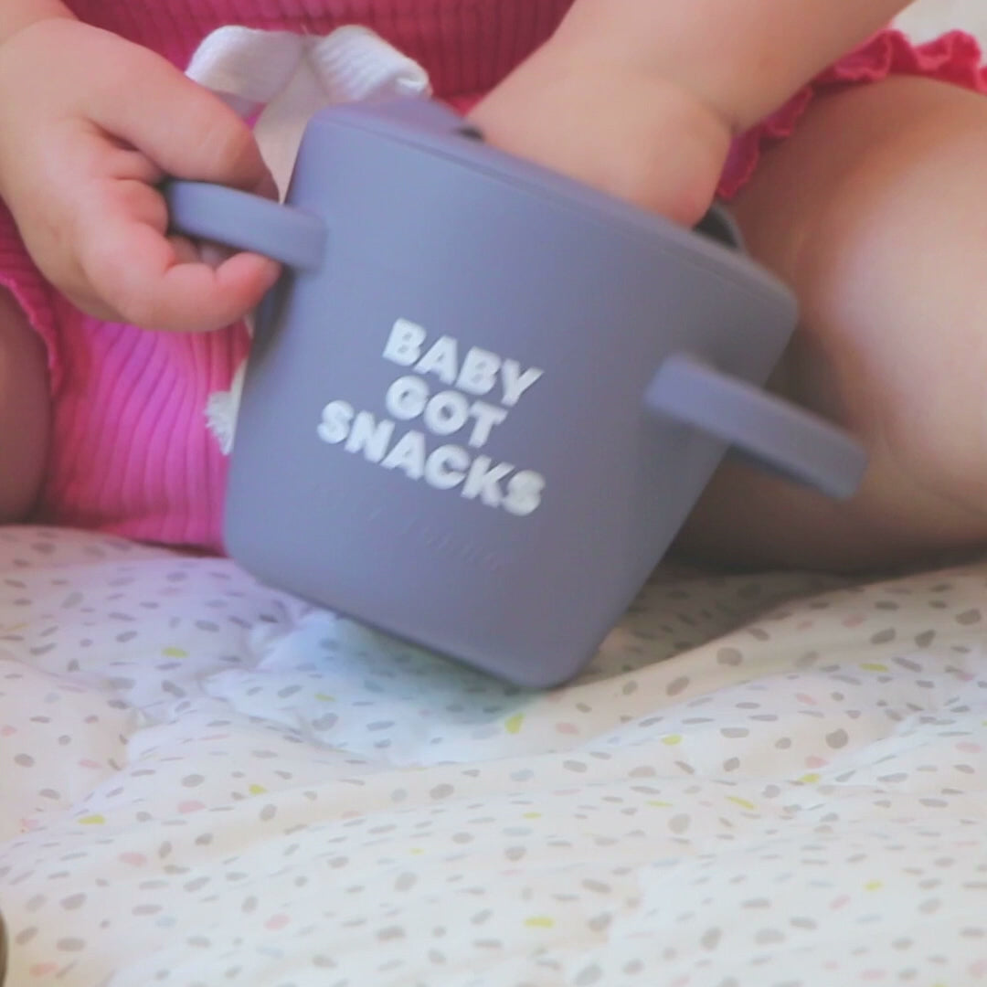 The Happy Snacker is a first-of-its-kind two-piece silicone snack cup with a mess-proof snap-tight lid and soft silicone opening so little hands can easily access food and prevent spills. Designed with easy-grip handles, it fits in car seats and stroller cup holders.
