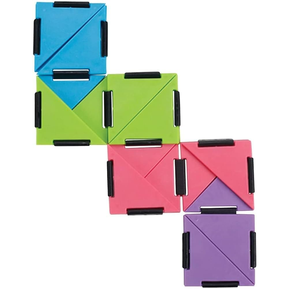 The U-Fidgit is brightly colored and made of many hinged shapes. Each U-Fidgit is made up of 21 colorful 2-inch hinged triangles. All are made with nontoxic, durable plastic. Comes in hot pink, bright blue, purple, or neon green colors. All color options have black hinges. A bright blue peggable blister packet with multicolored illustrations of the toy holds 1 U-Fidgit.